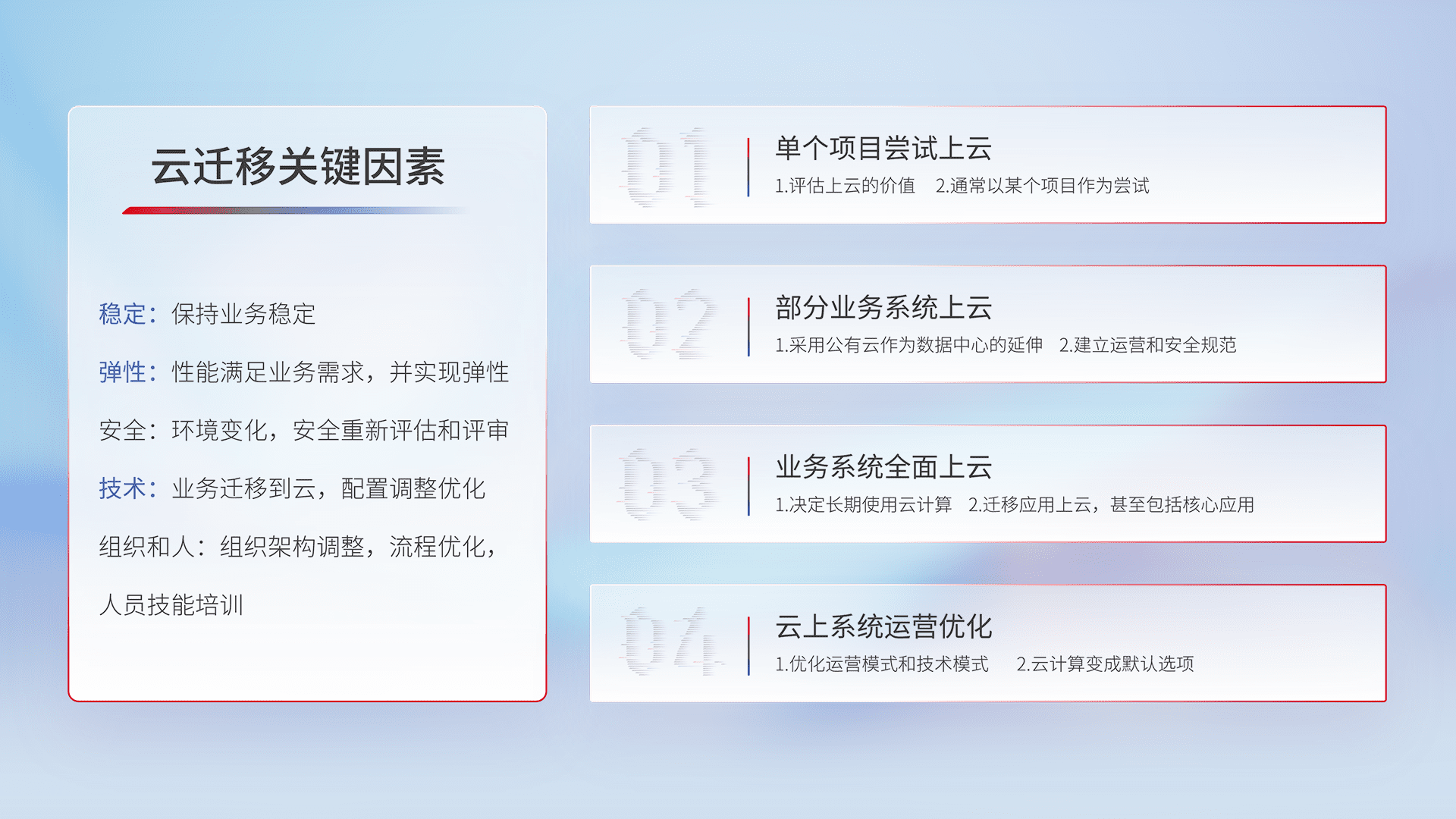 结合实际业务,,从规划设计、、、、云平台选型、、云原生改造、、数据迁移、、集成交付,,迁移全过程为客户识别最佳上云路径,,,,做好风险识别管理,,设计网络架构、、、身份权限、、安全审计合规、、、操作审计、、日志审计、、、监控告警策略、、、、多站点容灾设计等,,对云上基础设施进行整体规划,,,提升IT治理水平,,,,以满足弹性、、、高可用、、高性能的需求。。。