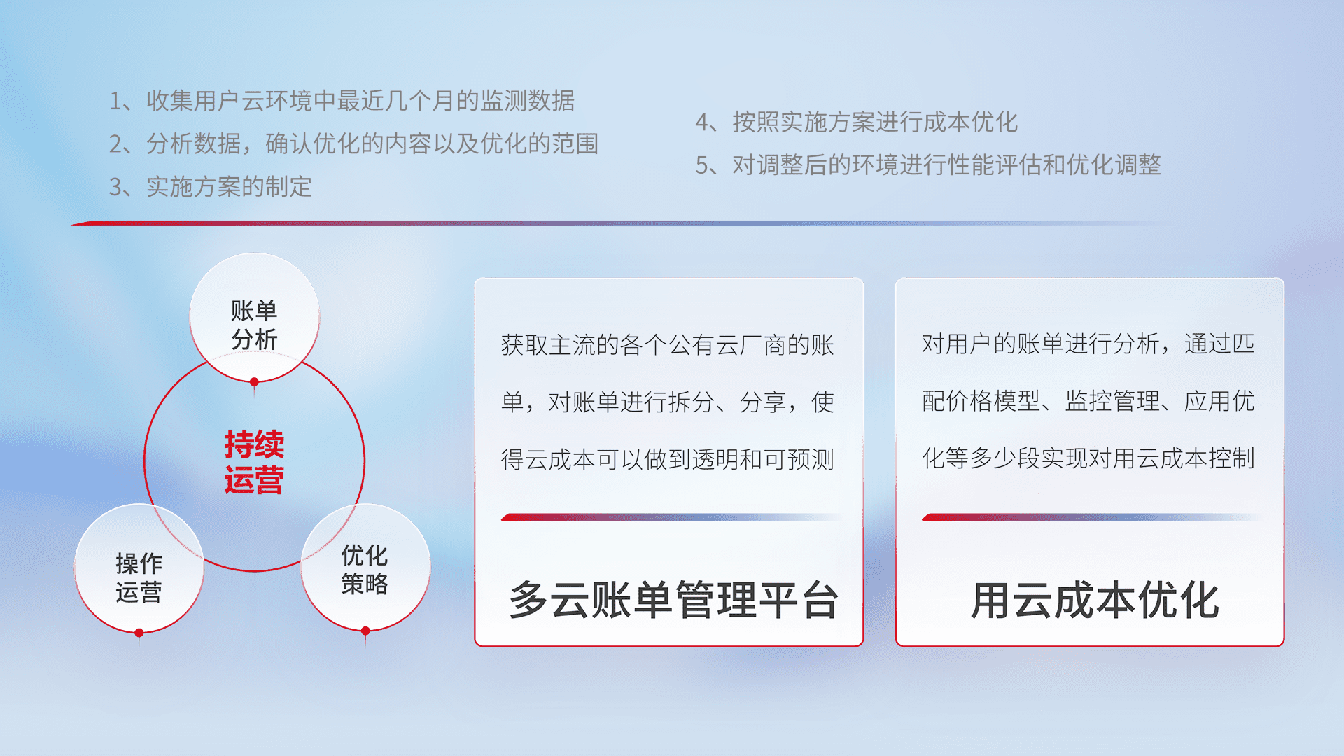 通过多云纳管,,,以统一的资源数据模型把客户的云资源进行抽象和封装,,,进而实现对多云资源的统一操作,,保障云资源管理的可靠性、、、、稳定性与可用性。。量身定制化运维内容,,,配置、、、开发运维、、、补丁管理、、备份、、、、监控、、、、认证和访问管理、、审计和日常巡检等,,保障在用云过程中的可靠度,,,稳定度以及高可用率。。。。